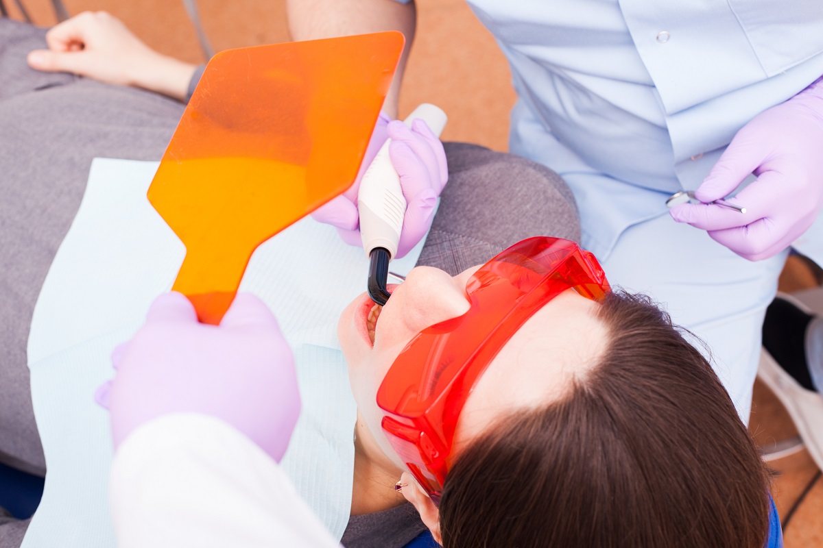 - Полимеризация. Когда зуб полностью сформирован, пломбу облучают ультрафиолетом, чтобы она застыла (если это фотополимер).